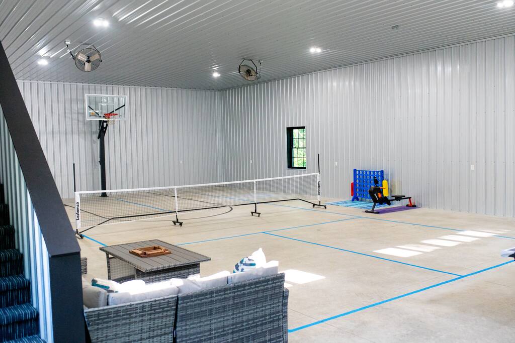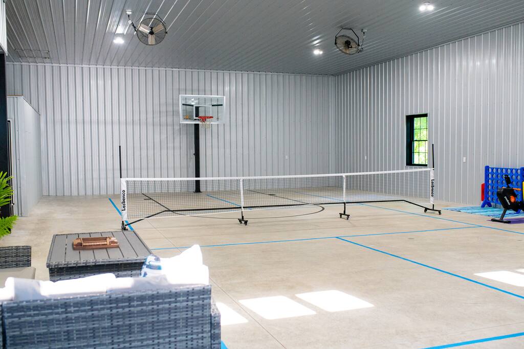 The Barndo Retreat at Stone Lake is a luxury, dog-friendly barndominium on 2 private acres with lake access just 3 min drive away. Enjoy an indoor pickleball & half basketball court, LED-lit hot tub with waterfall, firepit, and included beach gear. Perfect for Notre Dame games, family reunions, weddings, or wellness retreats. Unwind in upscale comfort with space to play, relax, and make memories - 30 minutes to Notre Dame and just under 2 hours from Chicago.